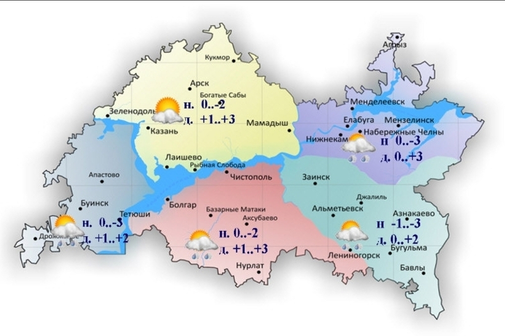 В понедельник, 3 ноября, на территории Татарстана сохранится облачная погода с прояснениями. Об этом сообщает Гидрометцентр РТ. В ночное время на территории республики местами возможен дождь с мокрым снегом. В дневные часы существенных осадков не ожидается. Синоптики также прогнозируют в отдельных районах туман в ночные и утренние часы. Ветер будет дуть северо-западный с переходом на юго-западный со скоростью 5-10 метров в секунду. Температура воздуха в ночные часы опустится до 0 - 3 градусов мороза. Воздух днем прогреется до +3 градусов. Синоптики не исключают гололедицу в ночное и утреннее время.