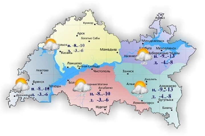 Температуры воздуха ночью составят 8-13 градусов, днем 3-8 градусов ниже нуля. В Казани в течение дня температуры будут колебаться от 4 до 6 градусов мороза.