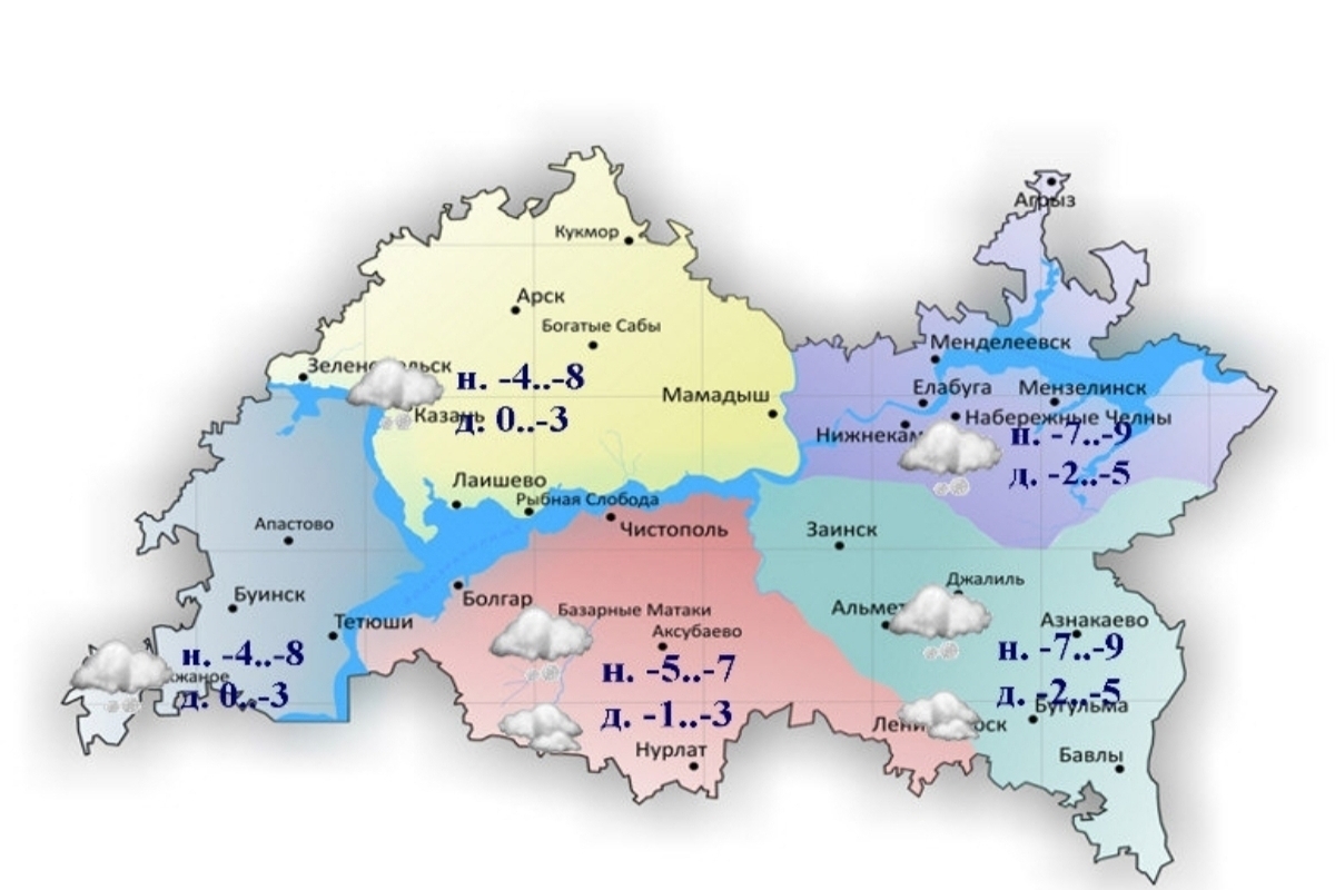 В четверг, 8 января, на территории Татарстана будет облачно с прояснениями. Ночью ожидается небольшой снег, местами умеренный. Днём в ряде районов пройдет мокрый снег с моросью, ожидается метель и гололед. Синоптики прогнозируют юго-восточный, южный ветер. Скорость ветра – 6-11 метров в секунду, местами порывами могут достигать 15-17 метров в секунду. Температура воздуха в ночные часы составит от 4 до 9 градусов мороза. Днём ожидается от 0 до -5 градусов. На дорогах сохранится гололедица, местами сильная, снежная каша, сообщает Гидрометцентр РТ.